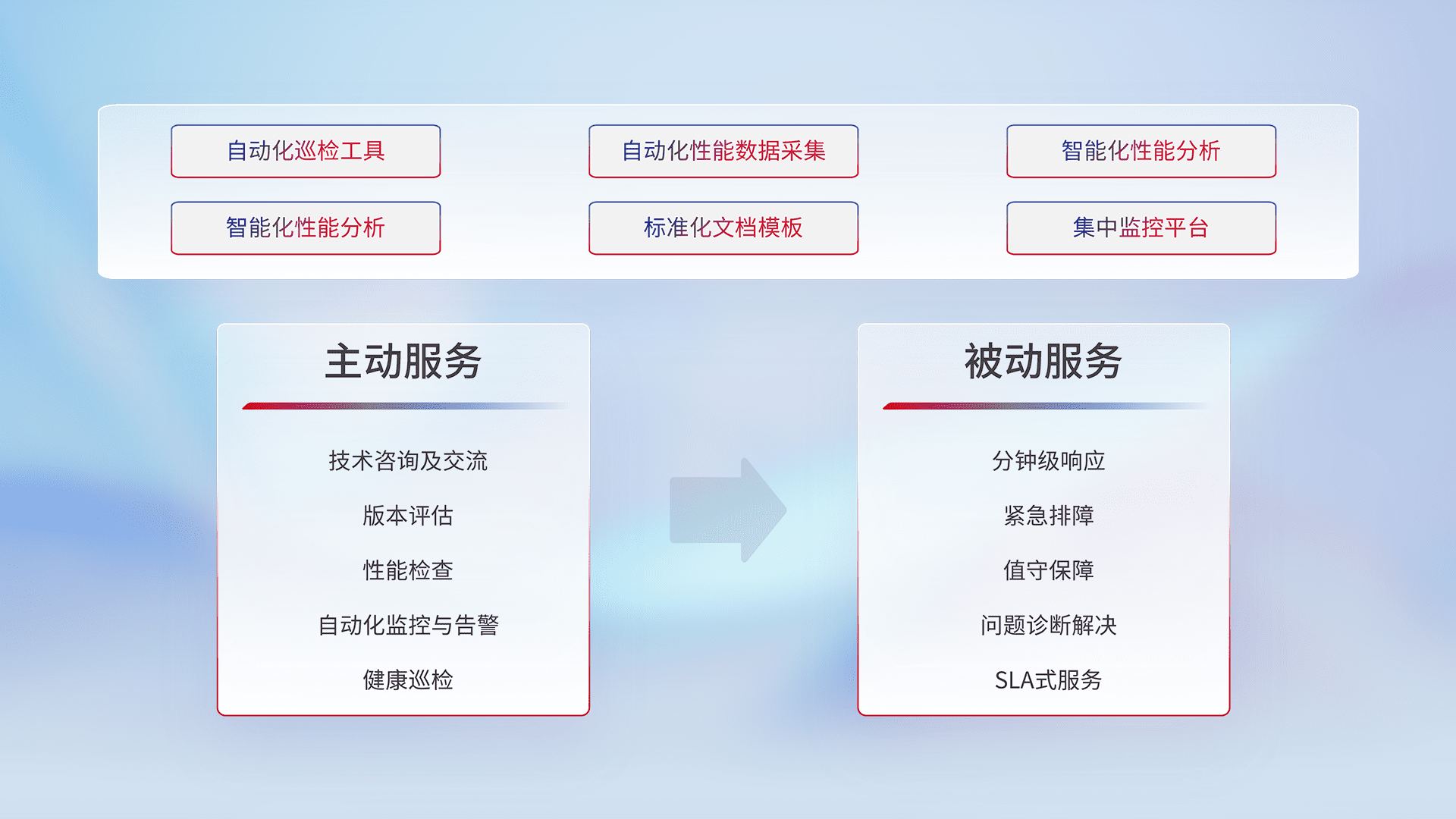 智能化工具和标准化文档,,保障服务质量,,提供主动服务(包含技术咨询、、、、版本评估、、性能检查、、自动化监控与告警、、、、健康巡检)和被动服务包含(分钟级响应、、、紧急排障、、、值守保障、、、问题诊断解决、、SLA服务)。。。。